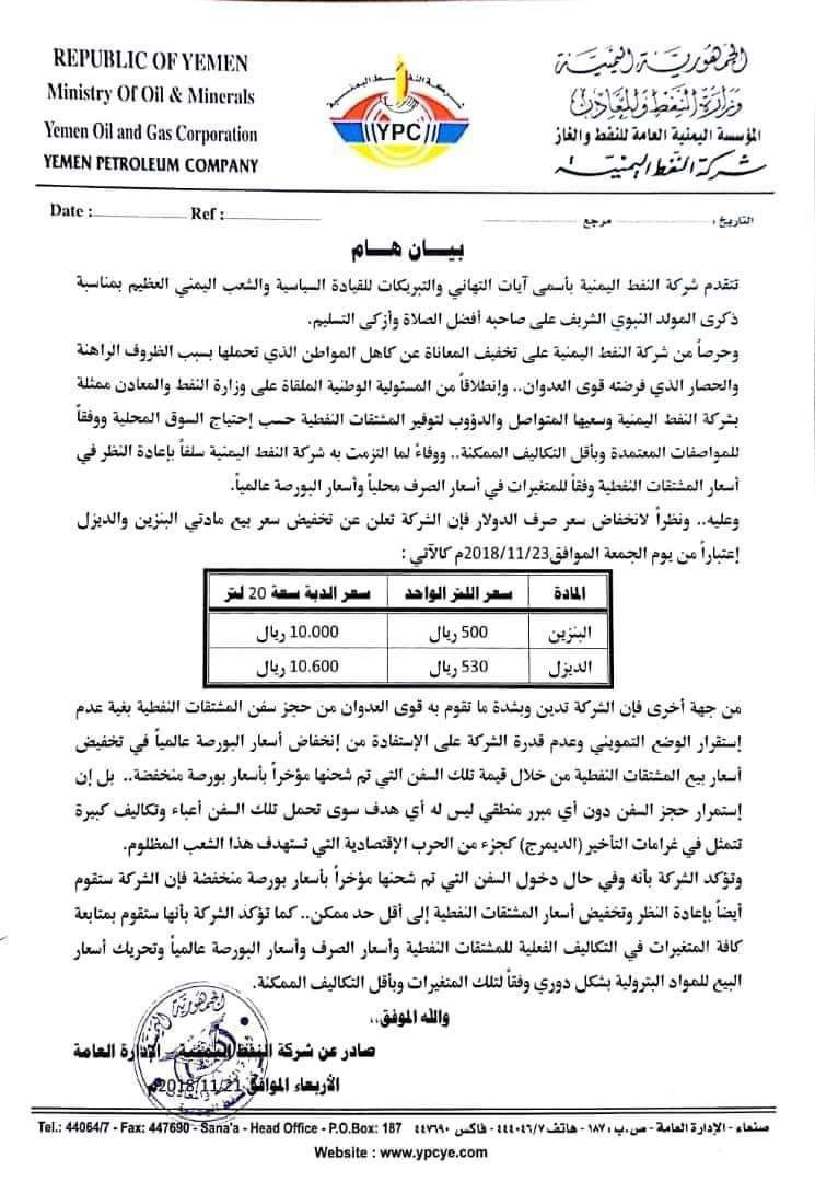 اعلنت شكة النفط في #صنعاء عن تخفيض أسعار المشتقات النفطية نظراً لتراجع صرف #الدولار.