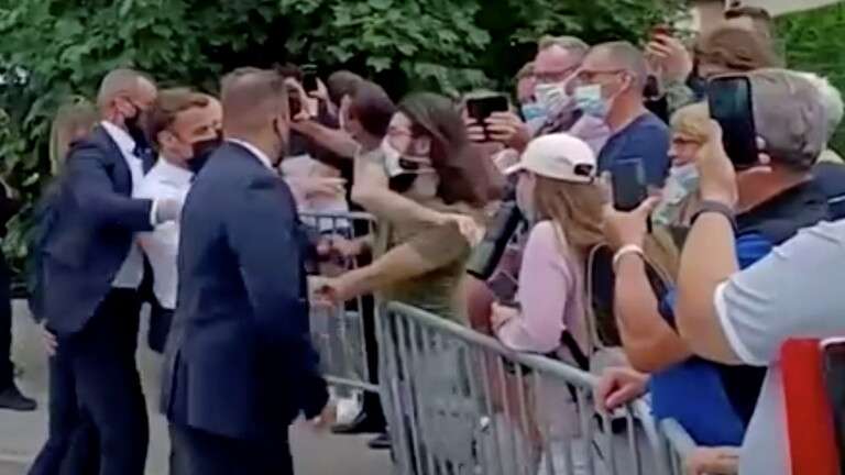 وتداولت مواقع التواصل الاجتماعي فيديو يظهر لحظة تعرض ماكرون لصفعة من مواطن أثناء جولة قام بها في مقاطعة لادروم.