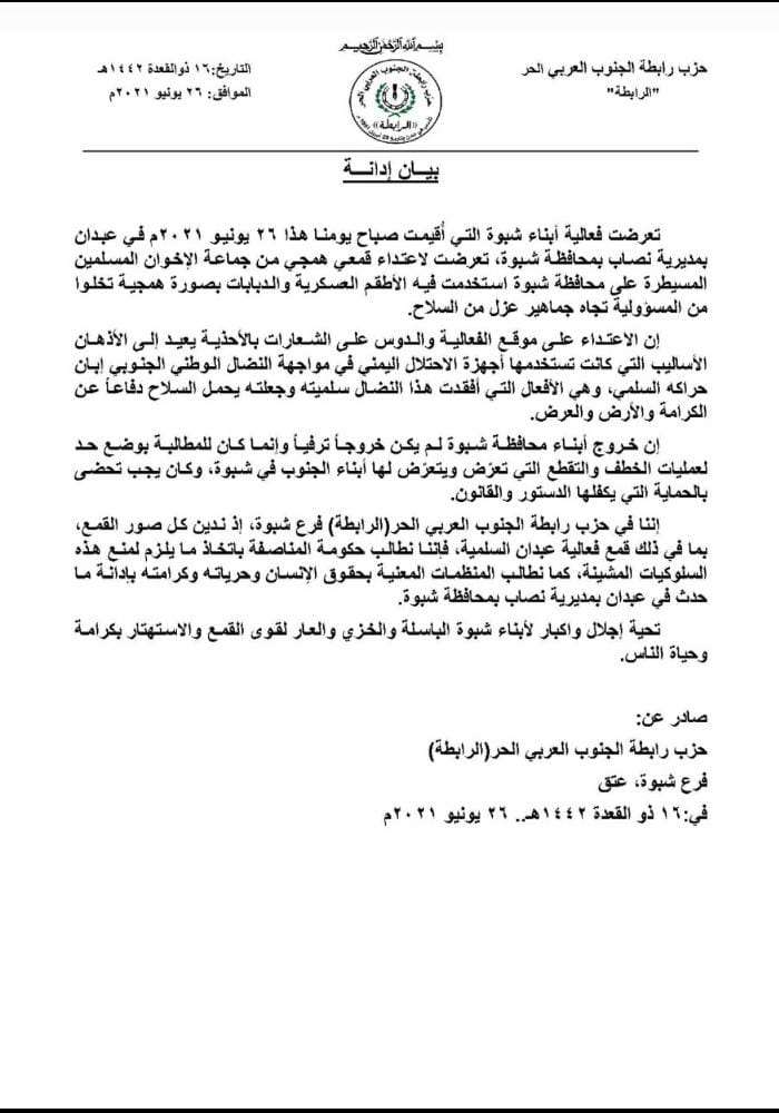 أدان حزب رابطة الجنوب العربي الحر (الرابطة) فرع شبوة، اعتداء القوات العسكرية التابعة لجماعة الإخوان المسلمين على فعالية ابناء شبوة التي اقيمت صباح ٢٦ يونيو ٢٠٢١م، في منطقة عبدان بمديرية نصاب بمحافظة شبوة.