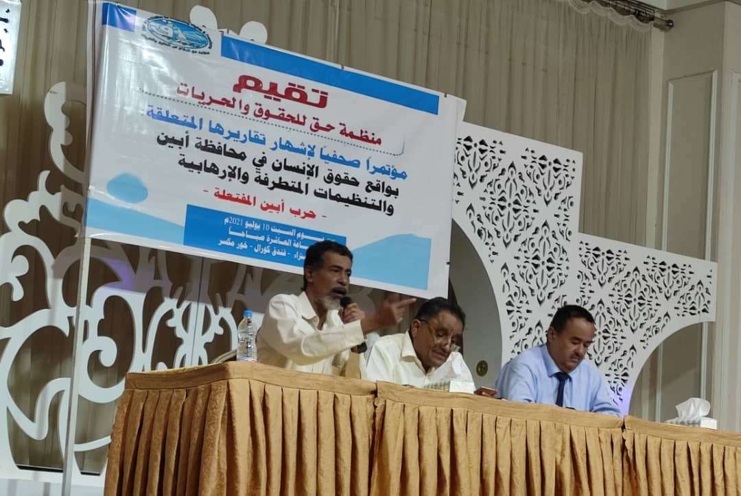 ضمن مسار نشاطها الدؤوب في المجال الحقوقي والإنساني وإعلاء لمبدأ الشفافية في النشاط الحقوقي والدفاع عن الحريات وحقوق الإنسان نظمت منظمة حق للحقوق والحريات صباح اليوم السبت 10 يوليو 2021م مؤتمرا صحفيا لإشهار تقريرها المعنون : " محافظة أبين ... واقع حقوق الإنسان والتنظيمات الإرهابية مارس 2011 - يوليو 2017 " وذلك في قاعة البتراء بفندق كورال بخور مكسر - عدن .