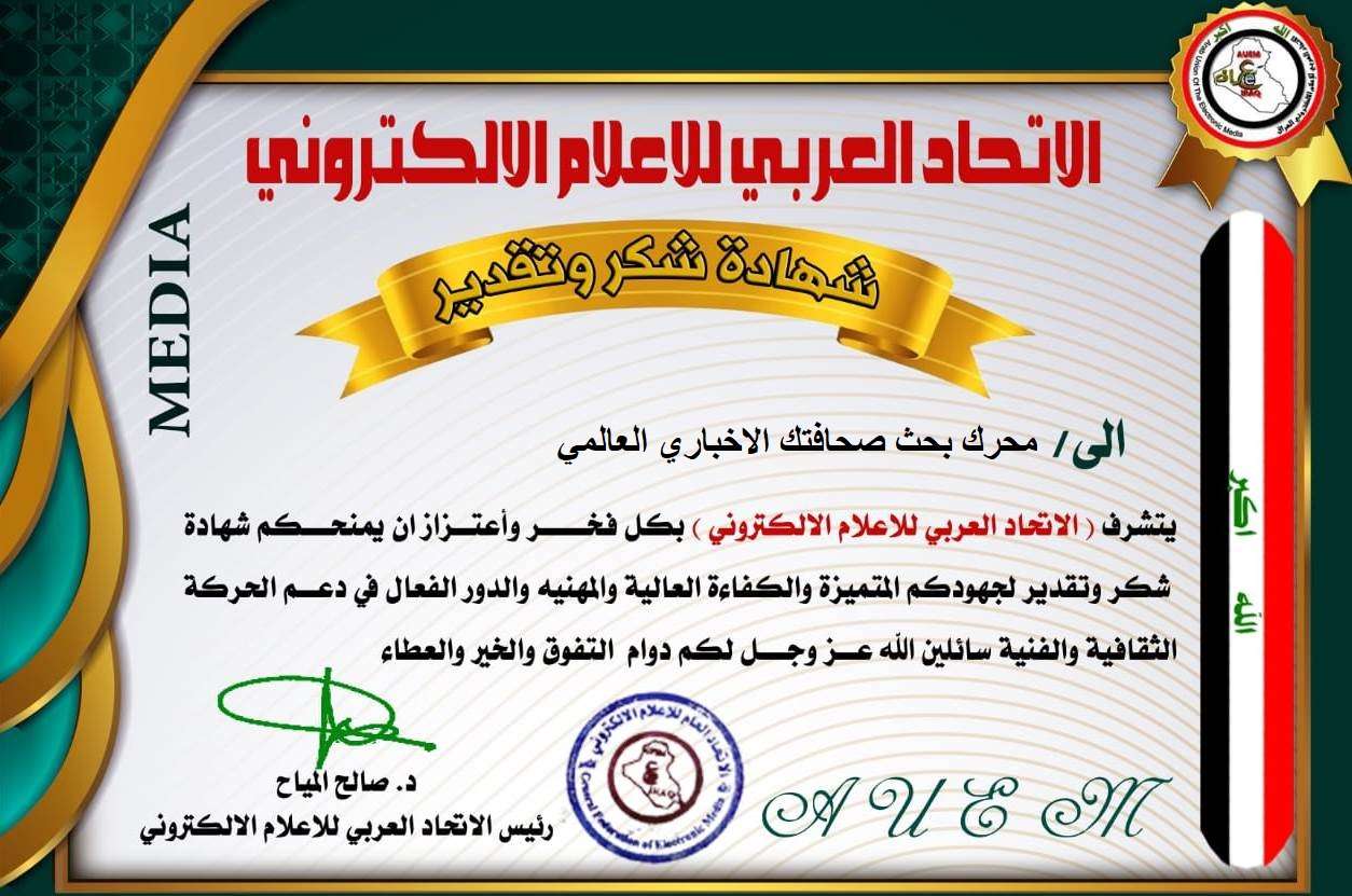 كرم الإتحاد العربي للإعلام الإلكتروني، ممثلاً بالدكتور صالح المياح، رئيس الاتحاد، محرك البحث الأخباري „صحافتك"، تقديراً لكفاءته المهنية العالية وتميزه في دعم الحركة الثقافية والفنية ..