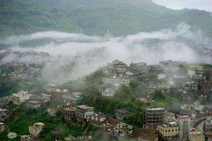 وتظهر الصورة مدينة إب بأجواء غائمة .
