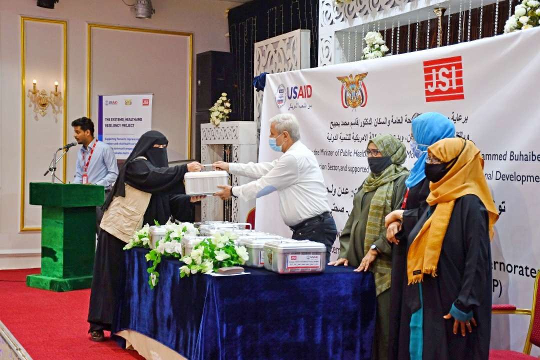 برعاية وزير الصحة والسكان الدكتور قاسم محمد بحيبح، دشن اليوم بمحافظة عدن مشروع التعافي وتقوية النظام الصحي (صحتي أولاً) التي تنفذه منظمة جون سنو بالشراكة مع الجمعية الوطنية للقابلات وبدعم من الوكالة الأمريكية للتنمية الدولية.