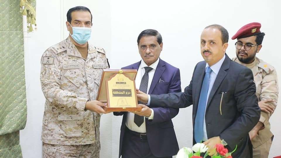 وسلّم محافظ حضرموت، الوزير الارياني ميداليات التحرير، والوفد السعودي المرافق له درع المنطقة وميداليات التحرير، نظير جهودهم ودعمهم ومساندتهم لقوات المنطقة العسكرية الثانية في عملية تحرير المكلا وساحل حضرموت من قبضة التنظيمات الارهابية.