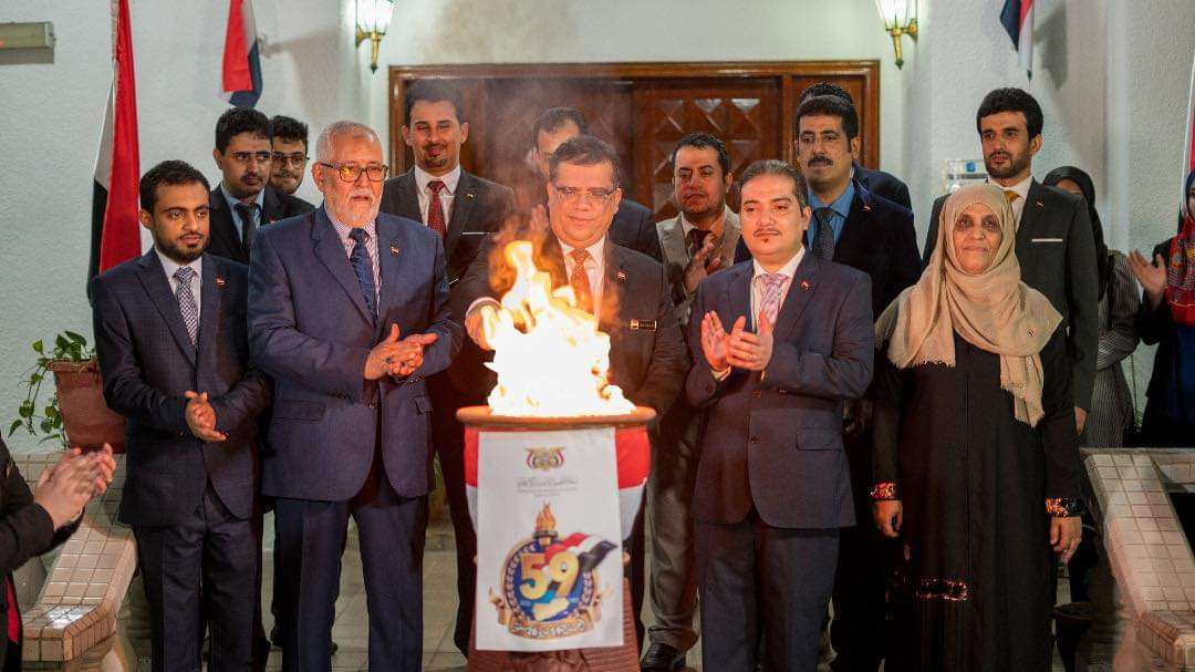 كما أشار السفير باحميد في كلمته إلى أن روح الثورة السبتمبرية والاكتوبرية لا تزال تسري إلى اليوم في ثبات وصمود أبطال القوات المسلحة والمقاومة الشعبية الذين يذودون عن الوطن وهويته ويدافعون عن سيادته أمام الانقلاب الغاشم للمليشيا الحوثية السلالية التي أرادت بانقلابها طمس هوية الثورة واستبدالها بهوية انقلابية ومشروع كهنوتي لا ينتمي إلى الأرض اليمنية ولا تنتمي إليه.