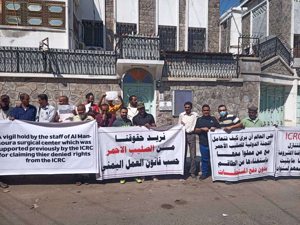 اقام العاملين في مجمع المنصورة الجراحي الذين كانو يعملون من ٢٠١٥ إلى ٢٠١٩ تحت ادارة الصليب الأحمر وقفه احتجاجية ثانية صباح اليوم امام مكتب اللجنة الدولية للصليب الأحمر في خور مكسر وذلك للمطالبة بالحقوق العمالية للافراد الذين عملو في المجمع الواقع في مديريه المنصورة والذي قامت منظمة الصليب الأحمر باغلاقه في منتصف عام ٢٠١٩ وتسريح عماله بدون اعطائهم حقوقهم المستحقة حسب قانون العمل اليمني .