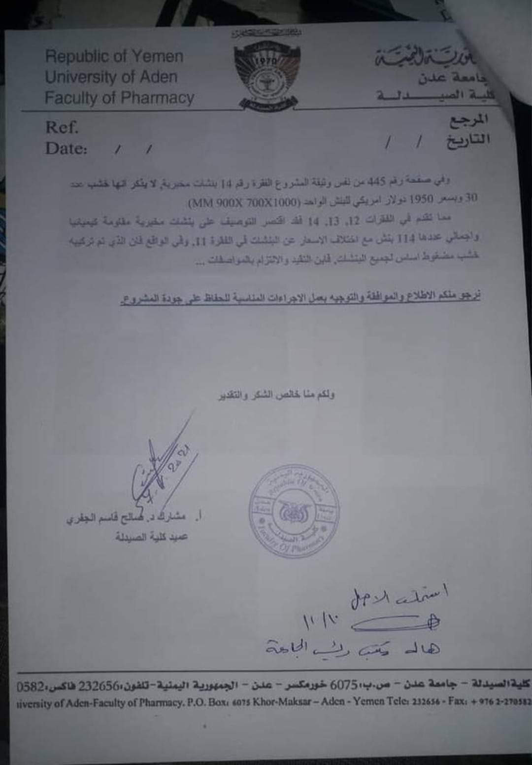وهنا مرفق في الصور مذكرة اعتراض عميد كلية الصيدله. للغش في اعمال التنفيذ .. فجاء الرد من توجيهات علياء من رئيس الحكومة باقالة عميد كلية الصيدلة