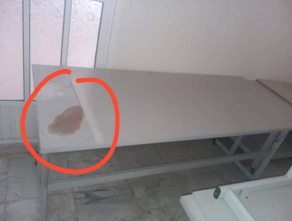 وبعد ان تم وضع قطرة من بعض محاليل المختبر . لتجربة مدى قدرتها على مقاومة المحاليل .تفتت خشب الطاولة كما هو واضح في الصورة.