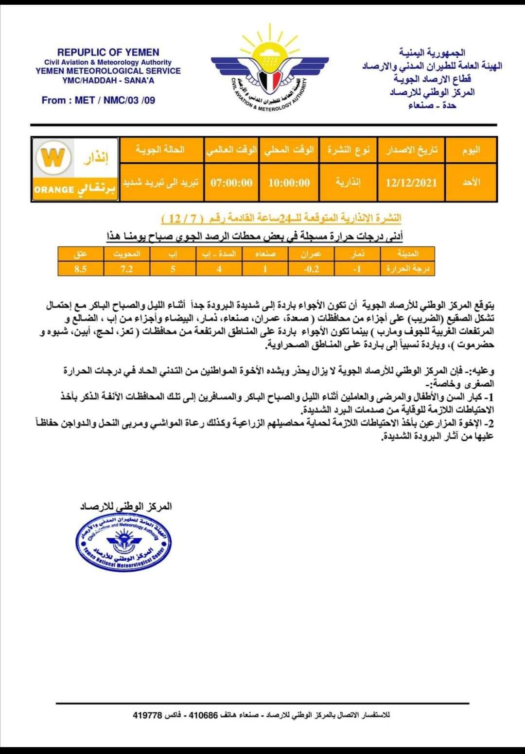 وعليه:- فإن المركز الوطني للأرصاد الجوية لا يزال يحذر وبشده الأخوة المواطنين من التدني الحاد في درجات الحرارة الصغرى وخاصة:-