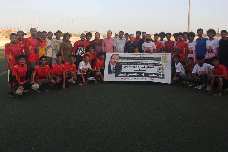 تحت رعاية شركة الصقور للحراسات الأمنية والخدمات العامة والتشغيل جرت مباراة على ملعب وحدة عدن مباراة بين منتخبي خورمكسر والشيخ عثمان على كأس الذكرى السادسة لاستشهاد اللواء جعفر محمد سعد.
