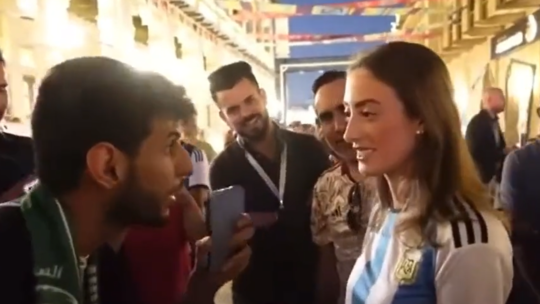 ما زالت المواقف الطريفة بين مشجعي بطولة كأس العالم في قطر تنتشر في مواقع التواصل الاجتماعي، حيث أظهر مقطع فيديو موقفا جديدا للمشجعة الأرجنتينية التي استهانت بالمنتخب السعودي سابقا.