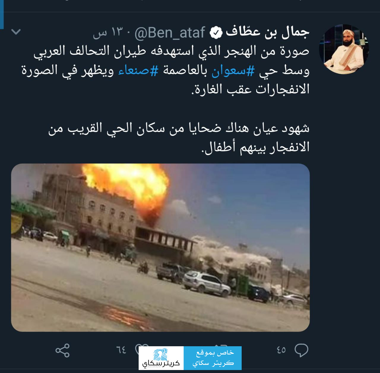 ومضى بن عطاف قائلا:"صورة من الهنجر الذي استهدفه طيران التحالف العربي وسط حي سعوان بالعاصمة صنعاء ويظهر في الصورة الانفجارات عقب الغارة."