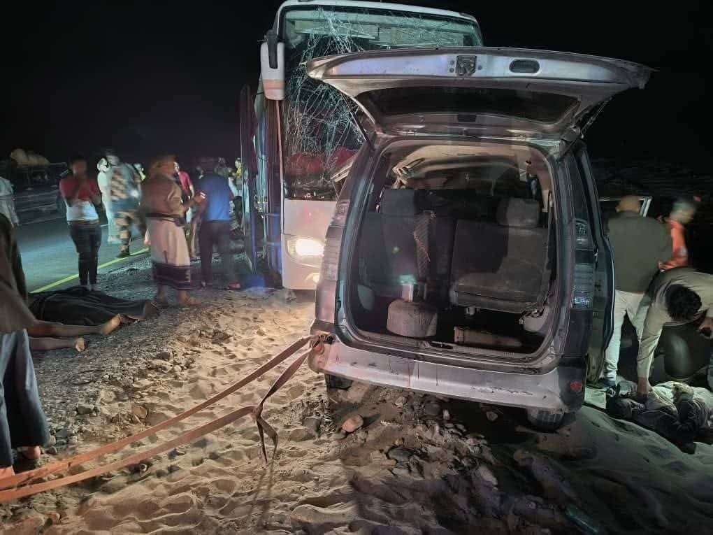 وقال الشهود : حادث مروري مؤسف ومروع وقع بخط عدن أبين بين باص فوكس متجه لعدن وحافلة نقل جماعي متجهه للمكلا .