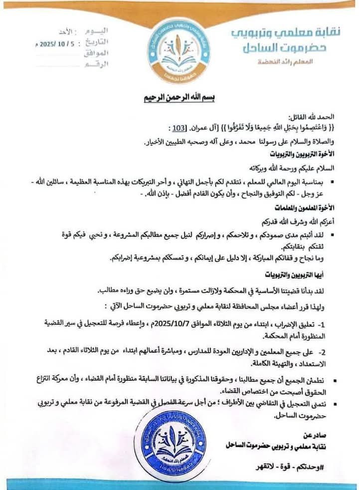 وجهت نقابة المعلمين والتربويين بساحل حضرموت دعوة لجميع المعلمين والتربويين إلى مباشرة أعمالهم في المدارس اعتبارًا من صباح يوم الثلاثاء وذلك بالتزامن مع بدء صرف المرتبات والحوافز.