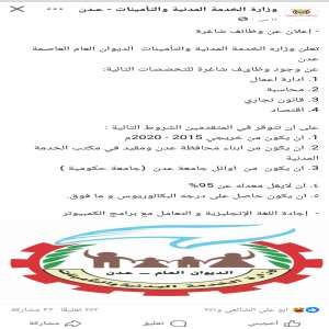 أعلنت وزارة الخدمة المدنية والتأمينات – الديوان العام بالعاصمة عدن، عن توفر عدد من الوظائف الشاغرة ف...