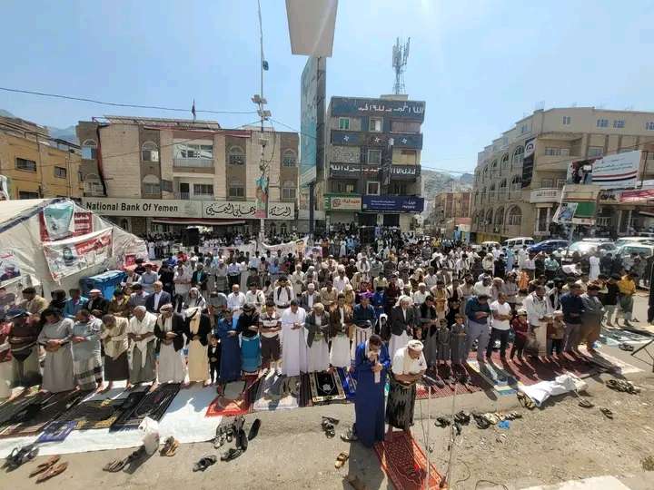 ادت جماهير تعز صلاة الجمعة السادسة في ساحة العدالة في شارع جمال عبدالناصر امام ديوان محافظة تعز.