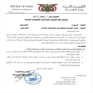 أصدرت وزارة المالية اليوم التعميم رقم (7) لسنة 2025م بشأن خطة أولويات الإصلاحات الاقتصادية الشاملة،...