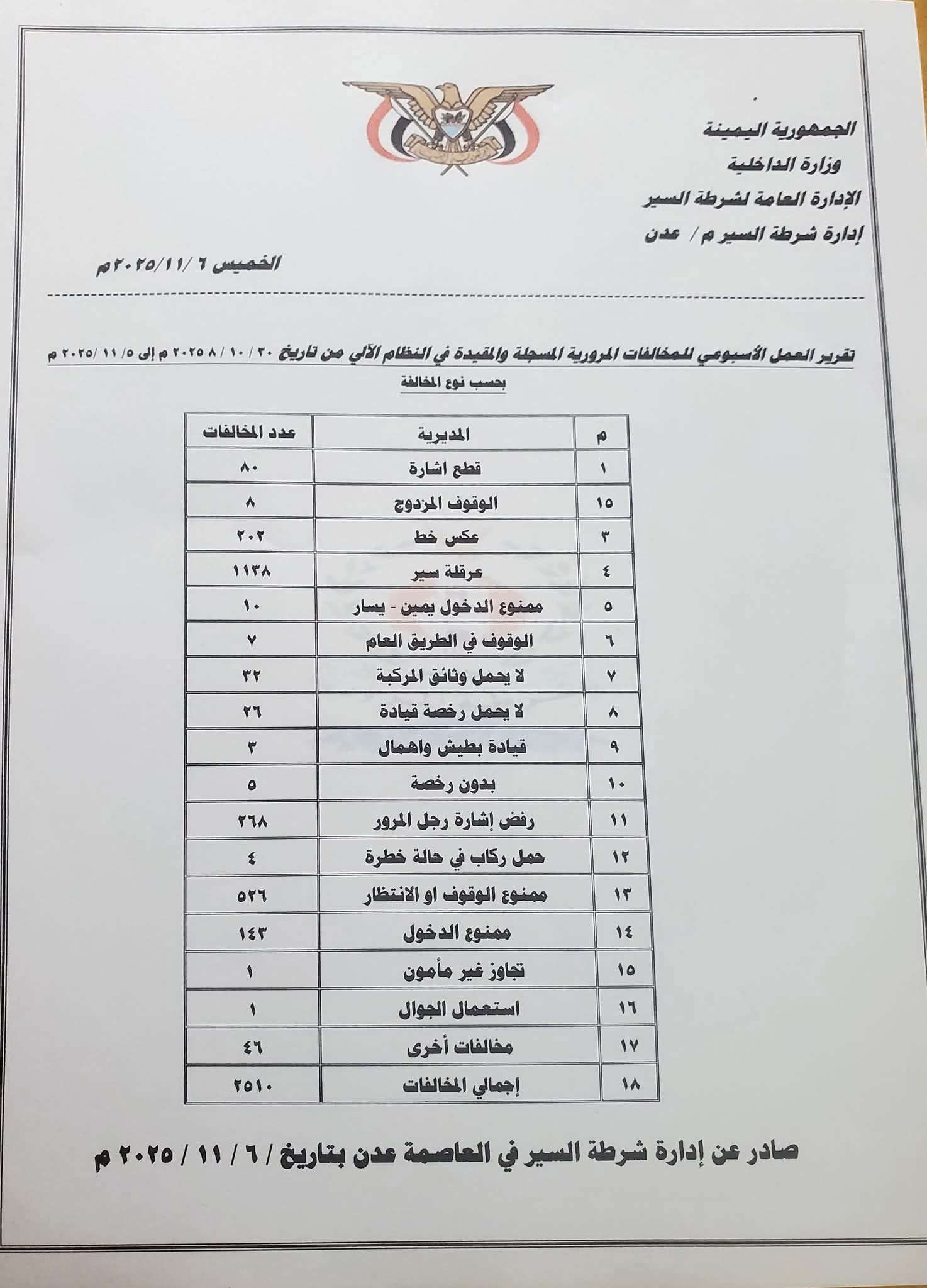 أصدرت الإدارة العامة لشرطة السير التابعة لوزارة الداخلية في عدن تقريرها الأسبوعي المفصل لأعداد المخالفات المرورية المسجلة والمقيدة في النظام الآلي خلال الفترة من 2025/10/30م إلى 2025/11/5م. وكشف التقرير عن تسجيل عدد كبير من المخالفات المرورية في العاصمة عدن.