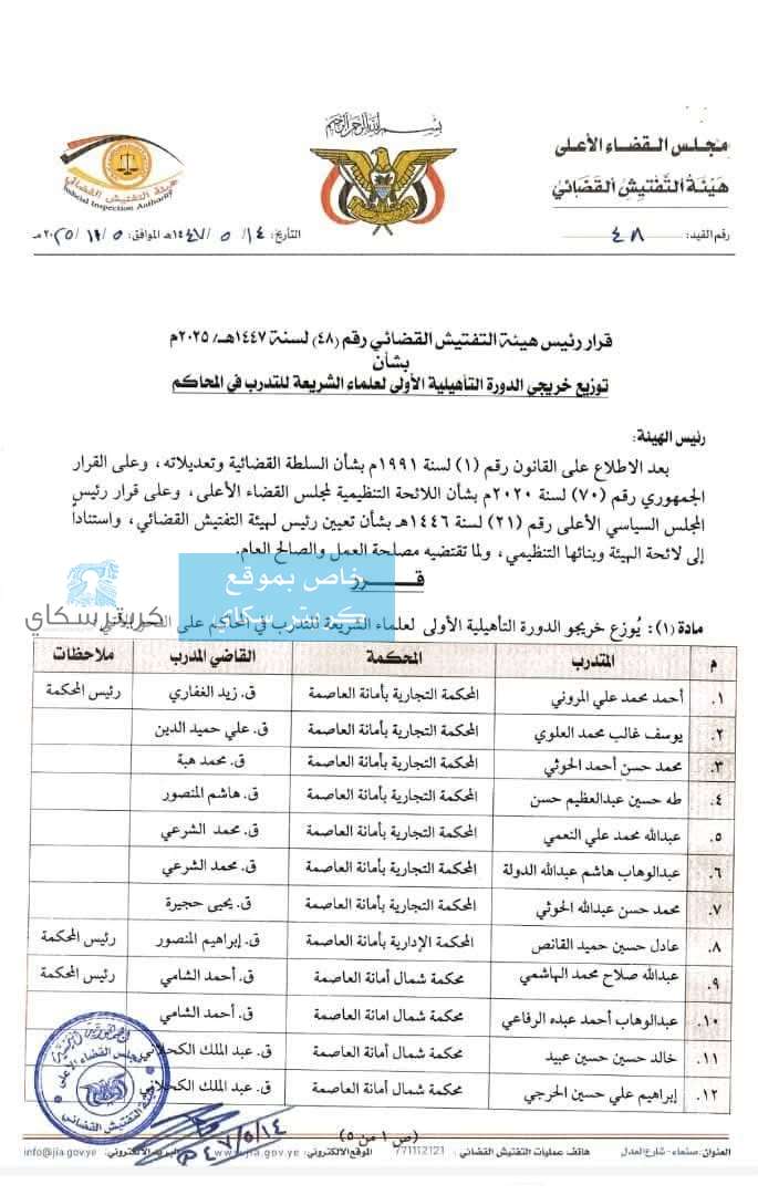 - أصدرت هيئة التفتيش القضائي التابعة لمجلس القضاء الأعلى الحوثي في صنعاء، الخاضعة لسيطرة مليشيا الحوثي، قراراً بتوزيع خريجي الدورة التأهيلية الأولى لـ "علماء الشريعة" للتدرب في محاكم العاصمة والمحافظات.