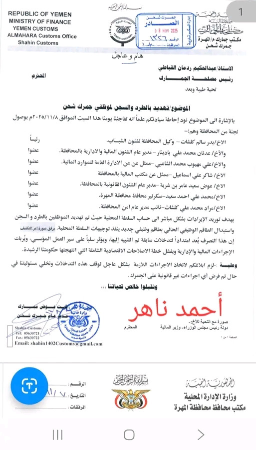 كما أرسلت رئاسة مصلحة الجمارك مذكرات رسمية إلى مجلس القيادة والحكومة للتدخل وإيقاف هذا الانقلاب الرسمي على قرار مجلس القيادة رقم 11 وتوجيهات رئيس الوزراء والمصلحة!.