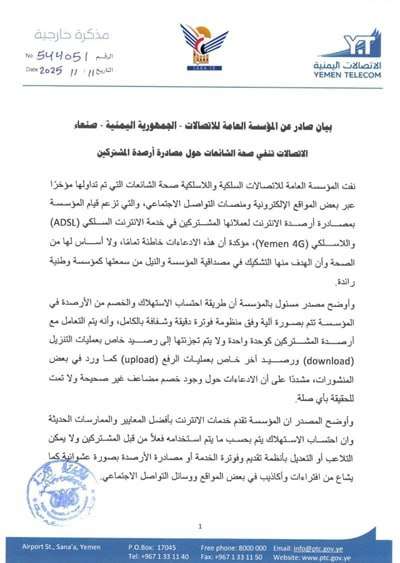 نفت مؤسسة الاتصالات التابعة للحوثيين المنشورات المتداولة حول مصادرة أرصدة الإنترنت لمشتركي الإنترنت السلكي ADSL واللاسلكي Yemen 4G، وتقول إن طريقة احتساب الاستهلاك والخصم من الأرصدة في المؤسسة تتم بصورة آلية .