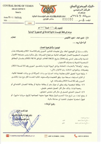 عمم بنك صنعاء المركزي على كافة المؤسسات المالية العاملة تحت إشرافه بضرورة الالتزام الصارم بتطبيق وثيقة هوية العميل في جميع المعاملات المصرفية.