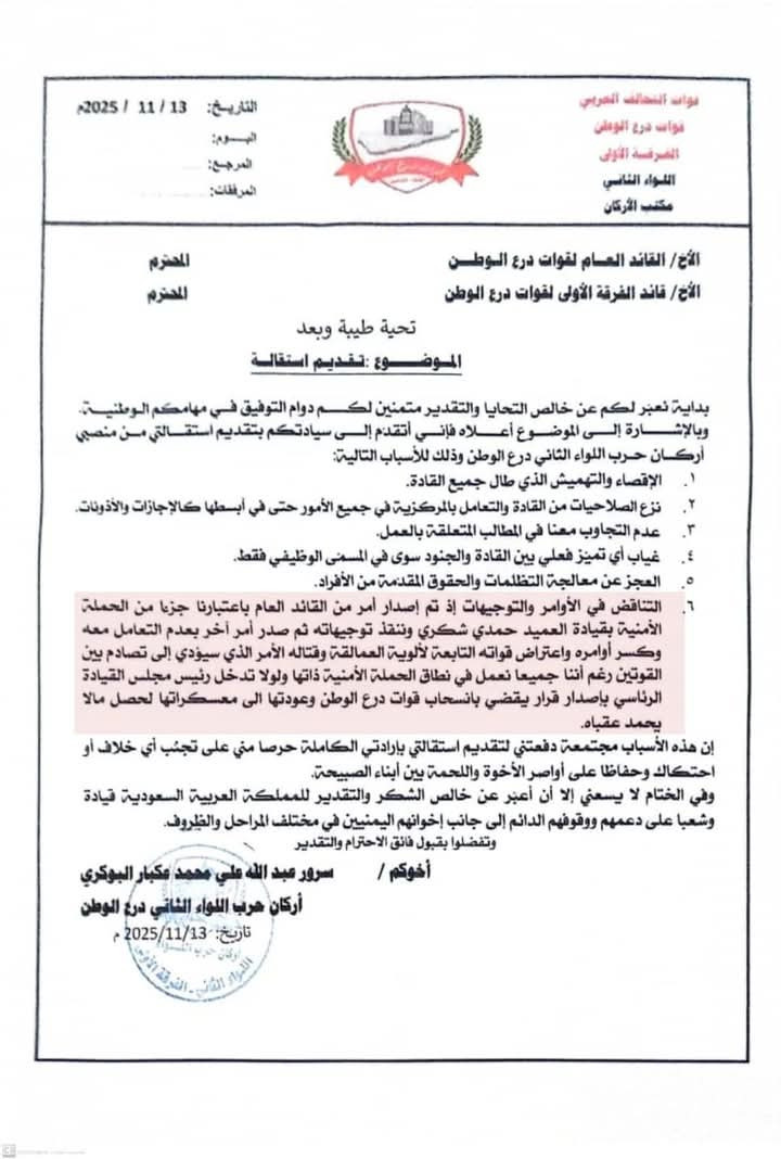 وأوضحت مصادر مطلعة أن الاستقالة جاءت نتيجة خلافات داخلية تتعلق بإدارة اللواء وسير العمل العسكري