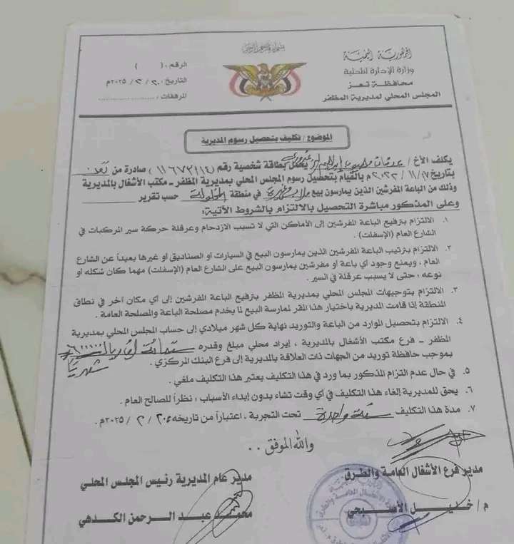 كشفت وثيقة رسمية مسربة قيام مدير عام مديرية المظفر في محافظة تعز بتاجير شارع الوليد وسوق الجملة والمخلولة لمستثمر .