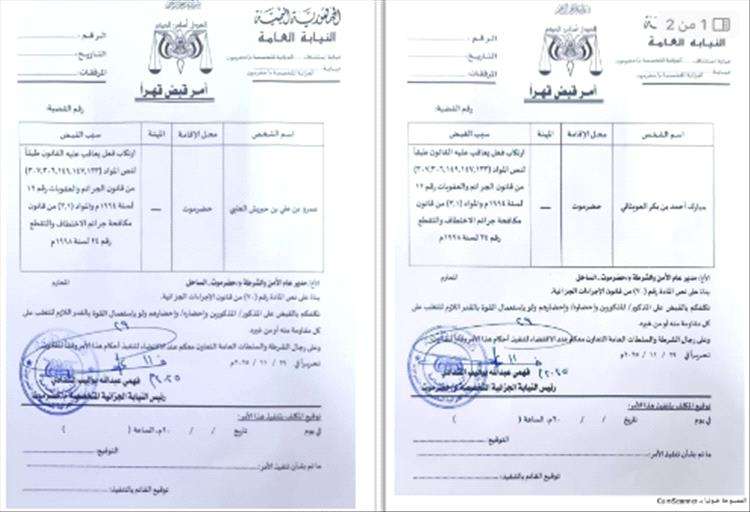 وبحسب الوثيقتين القضائيتين الصادرتين عن نيابة استئناف – الجزائية المتخصصة بحضرموت، فإن الأوامر تستند إلى مواد قانونية تشمل المواد 133، 147، 149، 6 ، 307، من قانون الجرائم والعقوبات رقم 12 لسنة 1994م، إضافة إلى مواد من قانون مكافحة الاختطاف والتقطع رقم 24 لسنة 1998م.
