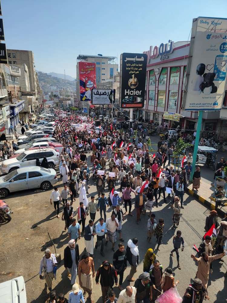 طالبت الحشود القيادة السياسية بمعالجة أوضاع الجرحى وأسر الشهـ ـداء ودعم الجيش الوطني لاستكمال تحرير تعز.