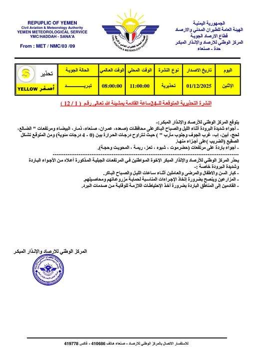 أصدر المركز الوطني للأرصاد والإنذار المبكر، اليوم الثلاثاء، النشرة التحذيرية رقم (1/12)، محذرًا من أجواء شديدة البرودة خلال الساعات الـ24 القادمة في عدد من المحافظات الجبلية.
