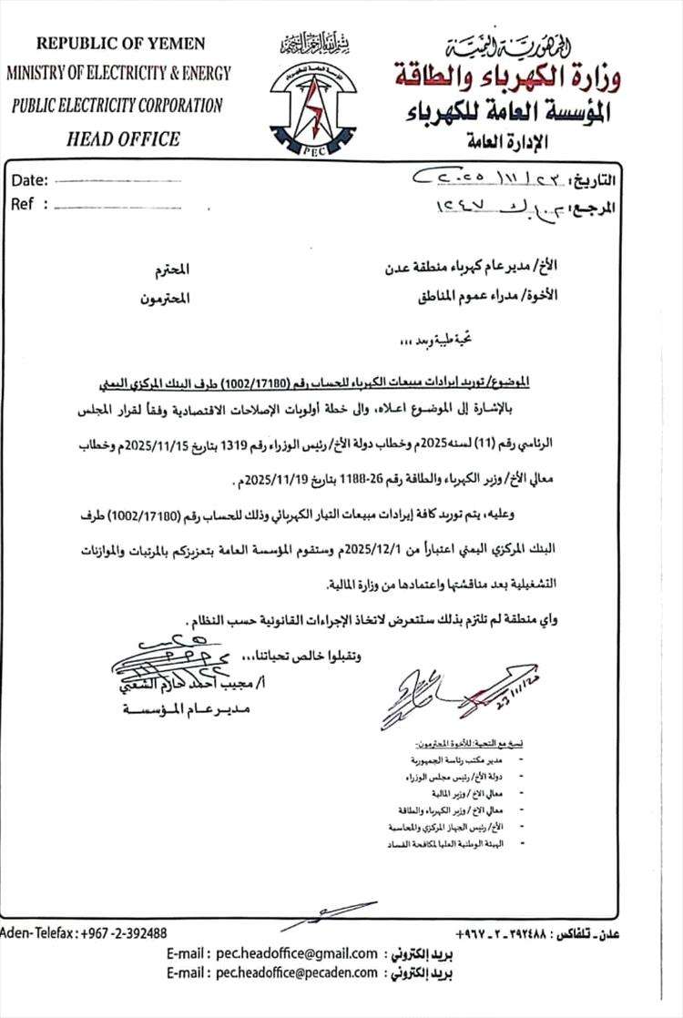 وجه الأستاذ مجيب أحمد حازم الشعبي، مدير عام المؤسسة العامة للكهرباء، خطاباً رسمياً إلى مدير عام كهرباء منطقة عدن ومدراء عموم المناطق، شدد فيه على ضرورة توريد كافة إيرادات مبيعات التيار الكهربائي إلى الحساب رقم (1002/17180) لدى البنك المركزي اليمني، ابتداءً من الأول من ديسمبر 2025م.