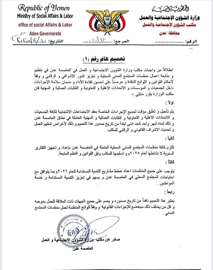 أصدر مكتب الشؤون الاجتماعية والعمل بالعاصمة عدن تعميم بشأن تنظيم عمل منظمات المجتمع المدني المحلية، وتعزيز الدور الإشرافي والرقابي
