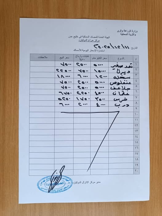 أعلنت الهيئة العامة للمصائد السمكية في العاصمة عدن، اليوم الخميس ، عن استقرار نسبي في أسعار الأسماك، مع تسجيل تفاوت بسيط في بعض الأصناف نتيجة تباين كميات العرض والطلب في الأسواق المحلية.