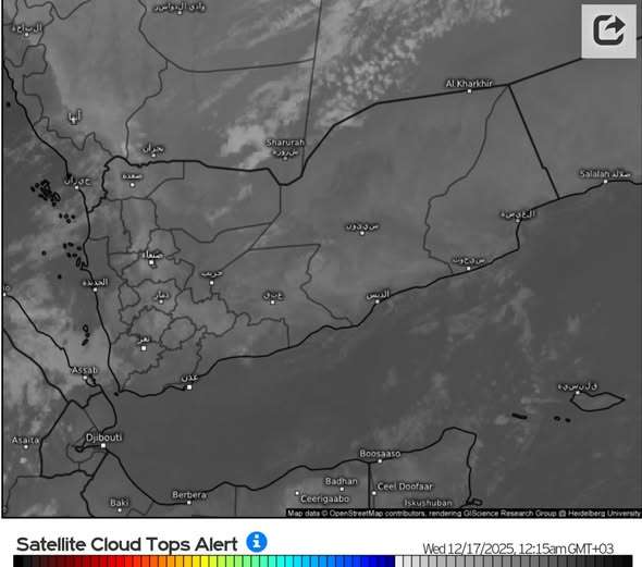 كما توقعت الأرصاد أجواء غائمة تغطي مناطق واسعة من اليمن خلال هذه الليلة ويوم غدٍ، مع توسع فرص هطول الأمطار يوم الأربعاء على مناطق متفرقة من البلاد، بعضها خلال النهار وأخرى ليلًا وفجرًا.