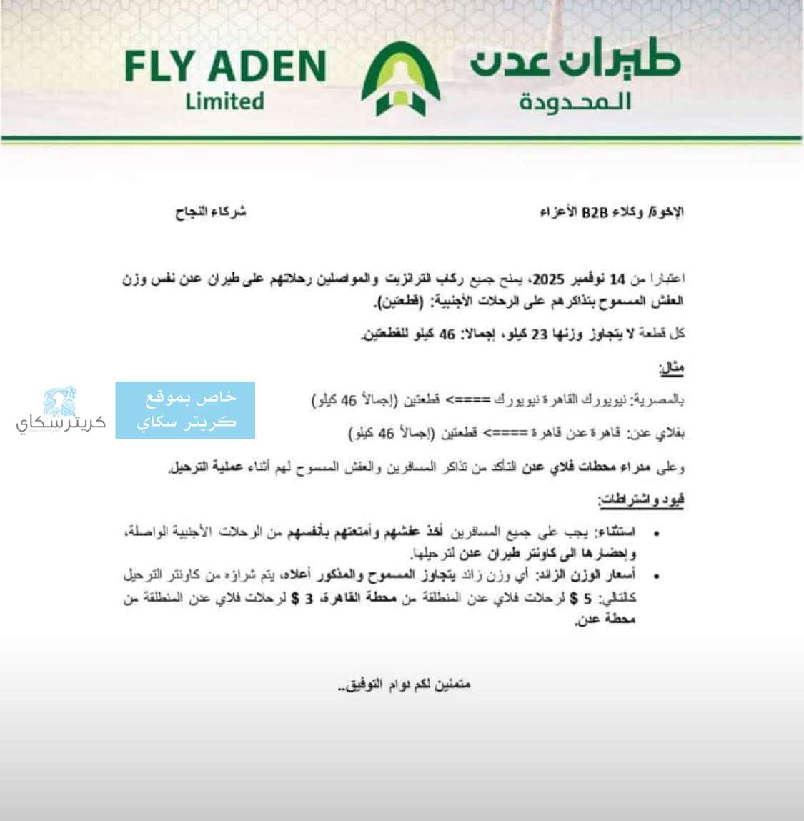 3 دولار لكل كيلو جرام إضافي للرحلات المنطلقة من محطة عدن.