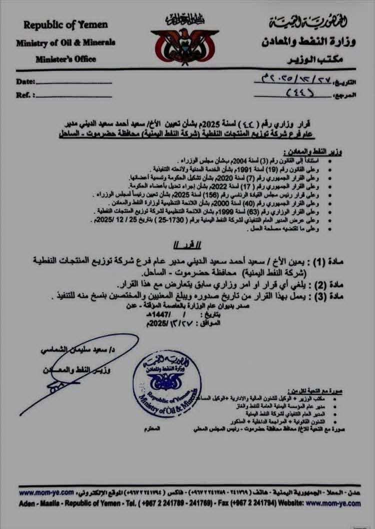 أُصدر اليوم قرار بتعيين سعيد أحمد الديني مديرًا عامًا لشركة نفط ساحل حضرموت.