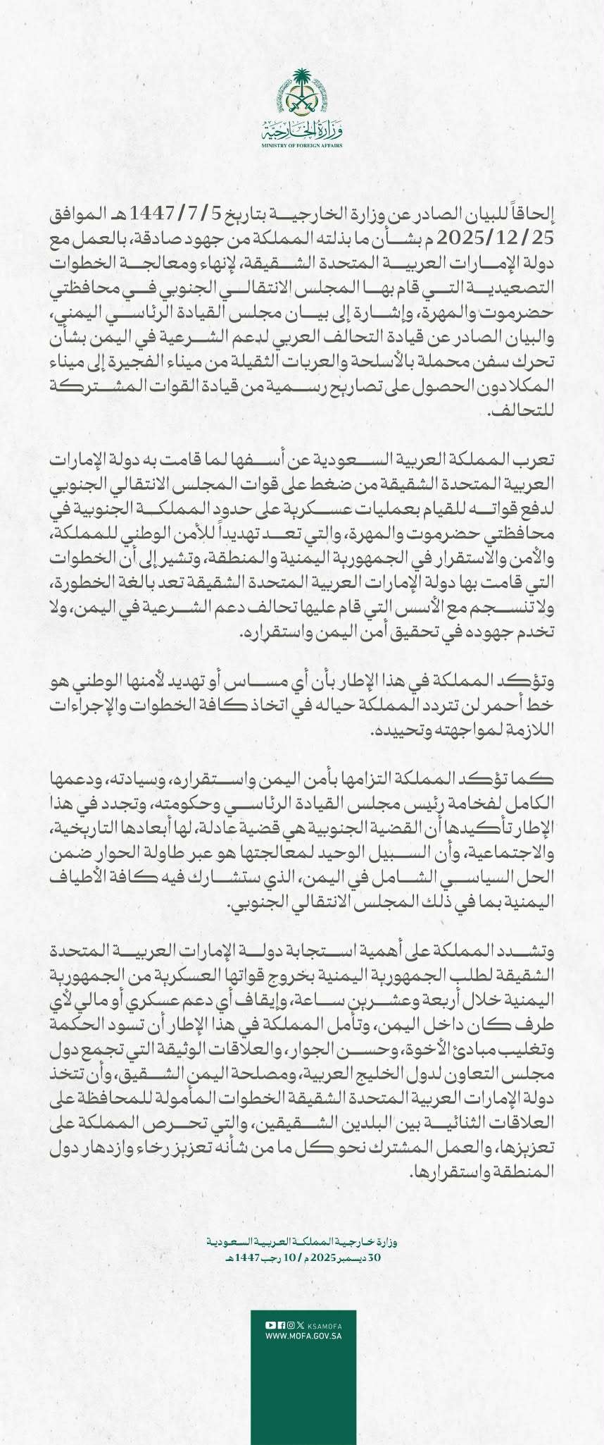 مطالبة بالانسحاب الفوري: شددت المملكة على ضرورة استجابة الإمارات لطلب الحكومة اليمنية بخروج قواتها العسكرية من اليمن خلال 24 ساعة، وإيقاف أي دعم عسكري أو مالي لأي طرف داخل البلاد.