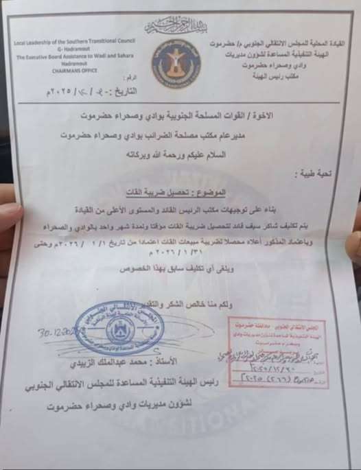 وأوضحت الوثيقة أن هذا القرار جاء بناءً على توجيهات من مكتب رئيس المجلس والمستوى الأعلى من القيادة، مشيرةً إلى إلغاء أي تكليف سابق بهذا الخصوص. وقد وُجه القرار إلى القوات المسلحة الجنوبية بوادي وصحراء حضرموت وإلى مدير عام مكتب مصلحة الضرائب بالوادي والصحراء للتنفيذ.