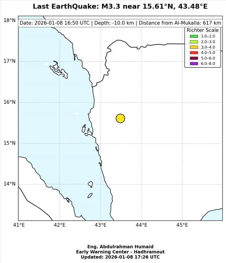 ووفق مركز حضرموت للإنذار المكبر فأن الهزة كانت محسوسة لثوانٍ، وتفاوتت شدتها من منطقة إلى أخرى، فيما لم تصدر الجهات الرسمية المختصة أي بيان حتى الآن يوضح تفاصيل الهزة أو قوتها ومركزها.