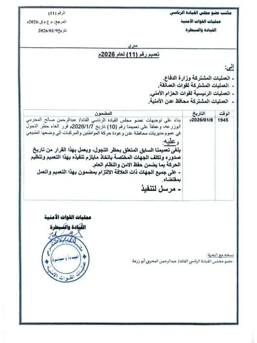 بناءً على توجيهات عضو مجلس القيادة الرئاسي، القائد عبد الرحمن صالح المحرّمي، تقرر إلغاء حظر التجوال في عموم مديريات العاصمة عدن، وعودة حركة المواطنين والمركبات إلى وضعها الطبيعي، ابتداءً من تاريخ صدور القرار.