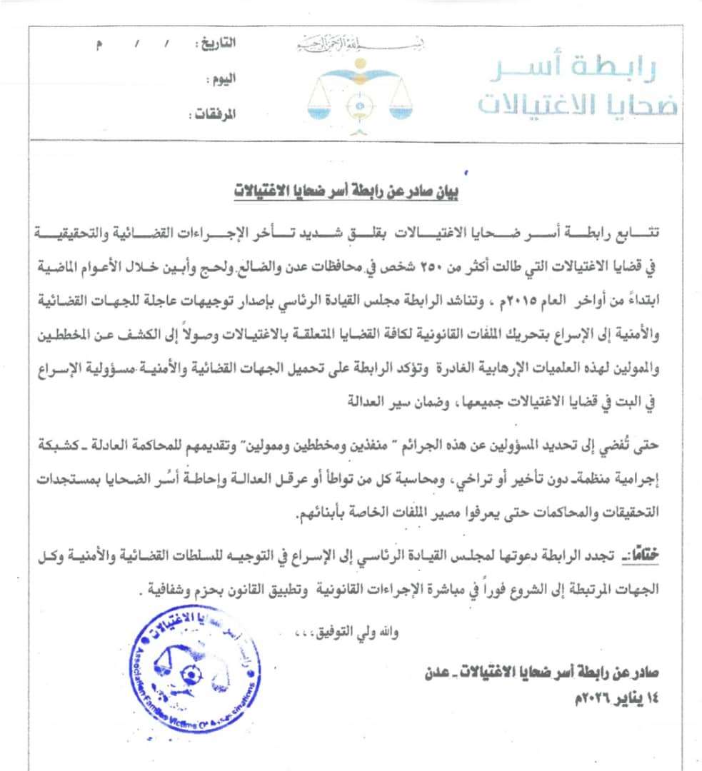 تتابع رابطة أسر ضحايا الاغتيالات بقلق شديد تأخر الإجراءات القضائية والتحقيقية في قضايا الاغتيالات التي طالت أكثر من ٢٥٠ شخص في محافظات عدن والضالع ولحج وأبين خلال الأعوام الماضية ابتداءً من أواخر العام ٢٠١٥م ، وتناشد الرابطة مجلس القيادة الرئاسي بإصدار توجيهات عاجلة للجهات القضائية والأمنية إلى الإسراع بتحريك الملفات القانونية لكافة القضايا المتعلقة بالاغتيالات وصولاً إلى الكشف عن المخططين والممولين لهذه العلميات الإرهابية الغادرة