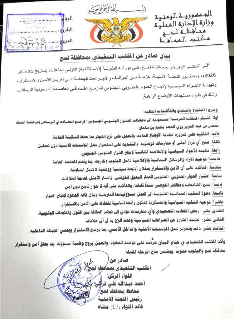 وفي ختام البيان، جدد المكتب التنفيذي حرصه على توحيد الجهود، والعمل بروح وطنية مسؤولة، بما يحقق أمن واستقرار محافظة لحج والجنوب عمومًا، ويضمن نجاح المرحلة المقبلة.