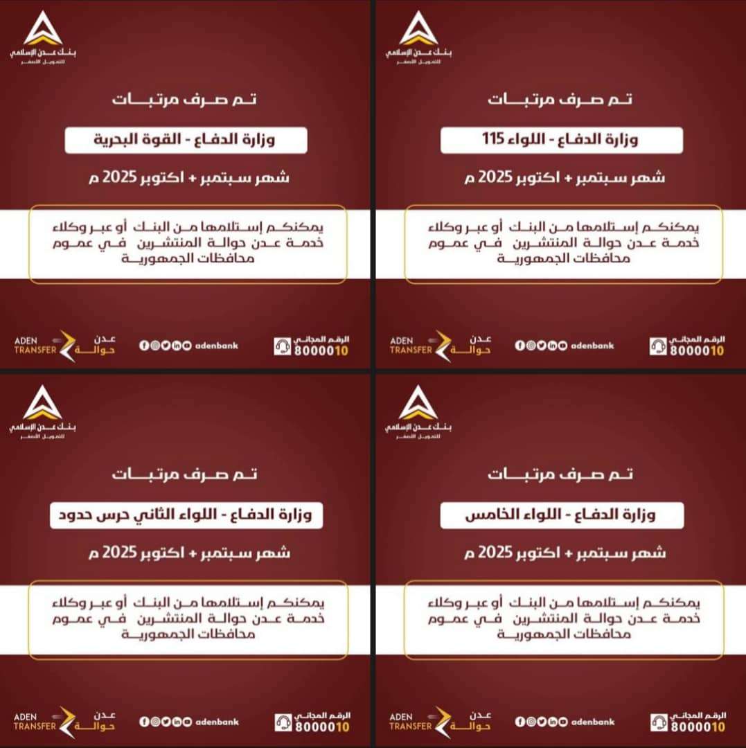 ويمكن استلام المرتبات عبر فروع البنك، أو شبكة عدن حوالة، أو نقاط الصرف التابعة للبنك.