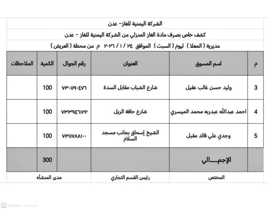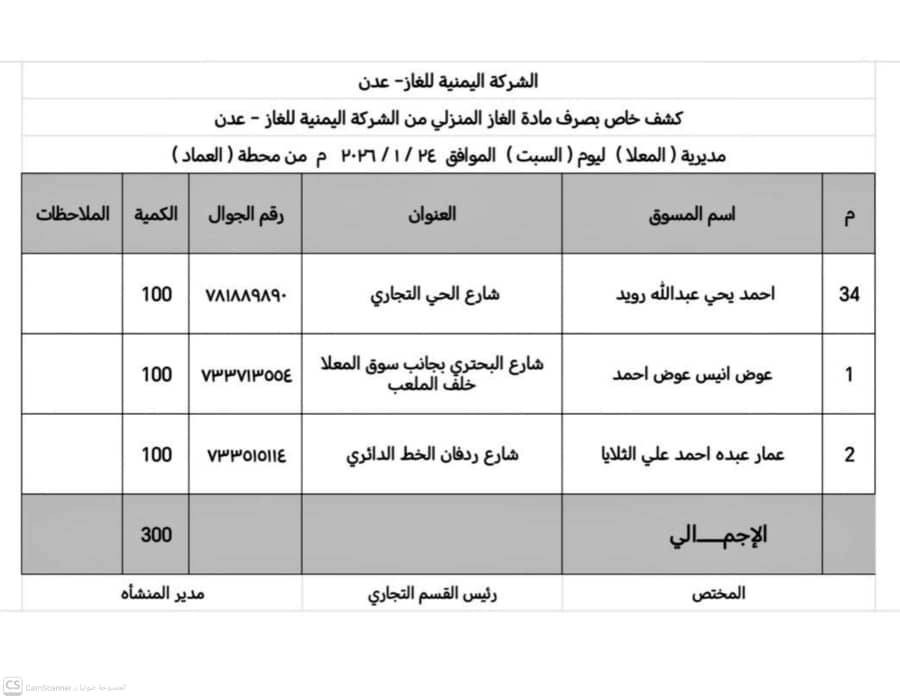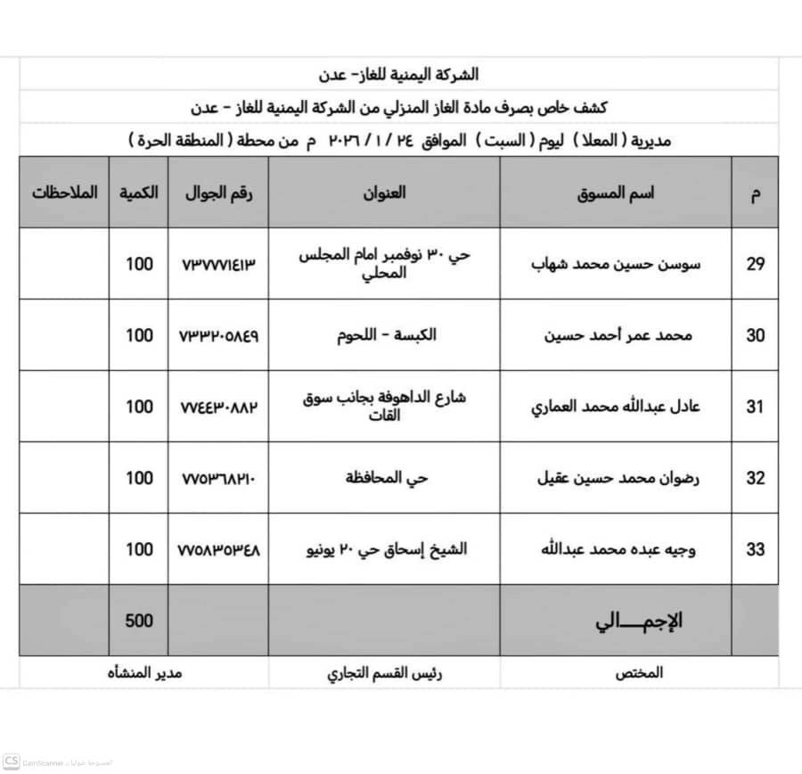 كشفت الشركة اليمنية للغاز، صباح اليوم، تفاصيل عمل محطات الغاز المركزية المخصصة لتعبئة أسطوانات الغاز المنزلي للمواطنين في العاصمة عدن، وآلية توزيع الكميات عبر مسوّقي الغاز في مختلف المديريات، وذلك وفق كشوفات رسمية معتمدة لشهر يناير 2026.