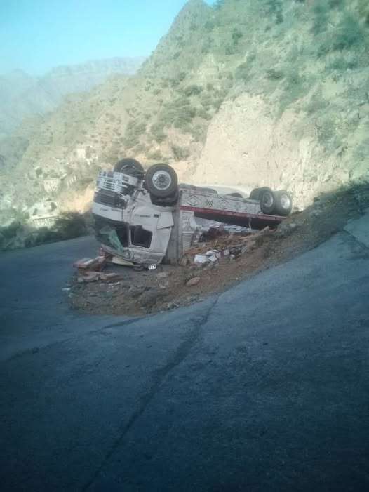 وأفاد مسافرون وشهود عيان، أن شاحنة انقلبت في وسط الطريق نتيجة الوعورة الشديدة والضيق الحاد للمنعطفات.