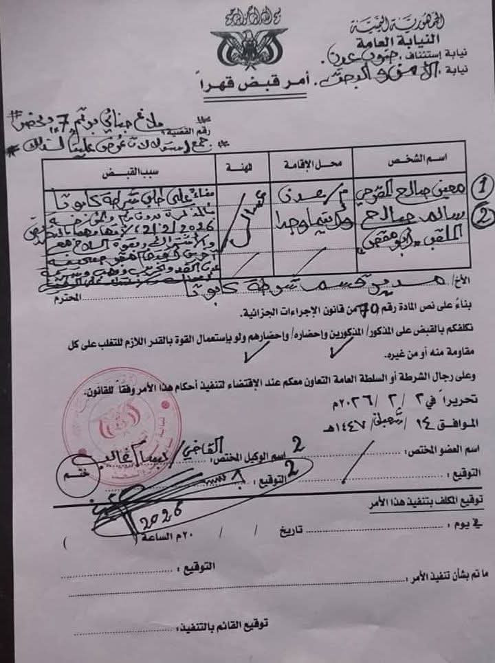 أصدرت النيابة العامة أمراً بالقبض القهري بحق شخصين من منتسبي المؤسسة العسكرية، وذلك على خلفية تورطهما في واقعة الاقتحام المسلح التي استهدفت مؤسسة "عدن الغد" للإعلام.
