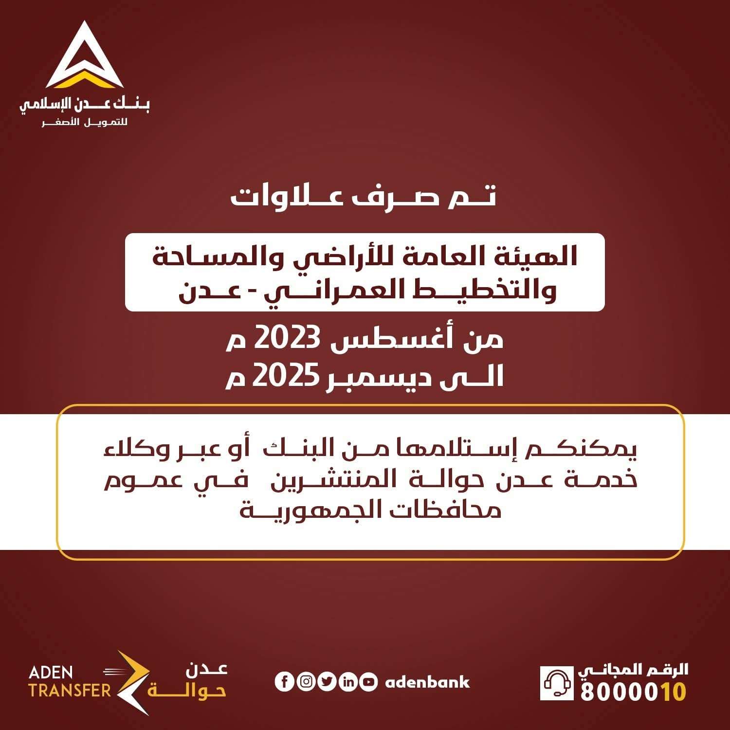 أعلن بنك عدن عن بدء صرف علاوات موظفي الهيئة العامة للأراضي والمساحة والتخطيط العمراني – عدن، وذلك عن الفترة الممتدة من شهر أغسطس 2023م وحتى ديسمبر 2025م.