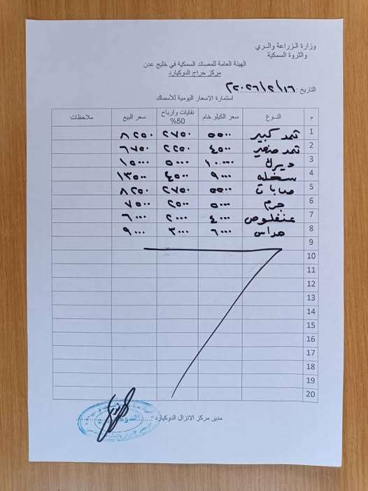 أصدر مركز حراجات الكود التابع للهيئة العامة للمصائد السمكية في خليج عدن، بمحافظة الكود، نشرة الأسعار اليومية للأسماك ليوم الاثنين 16 فبراير 2026م، موضحاً أسعار الكيلو جرام قبل وبعد إضافة هامش الربح بنسبة 50%.