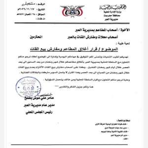 أصدرت السلطة المحلية بمديرية العبر التابعة لمحافظة حضرموت، قراراً رسمياً يقضي بتنظيم مواعيد عمل المط...